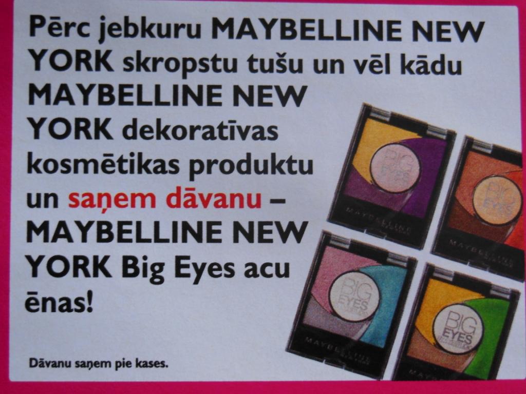 Pērkot jebkuru Maybelline skropstu tušu un vēl kādu Maybelline dekoratīvās kosmētikas produktu, dāvanā Maybelline Big Eyes acu ēnu kvartetu. Izvēle: četras dažādas paletītes.